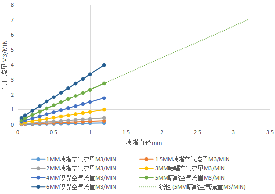 縱坐標為氣體流量測試數值,橫坐標為調整設置不同氣體壓力變化,不同顏色表示的是不同噴嘴直徑的測試條件。從上表圖形可以看出,流量是由設置氣體壓力和噴嘴直徑決定的,并是線性正相關性。