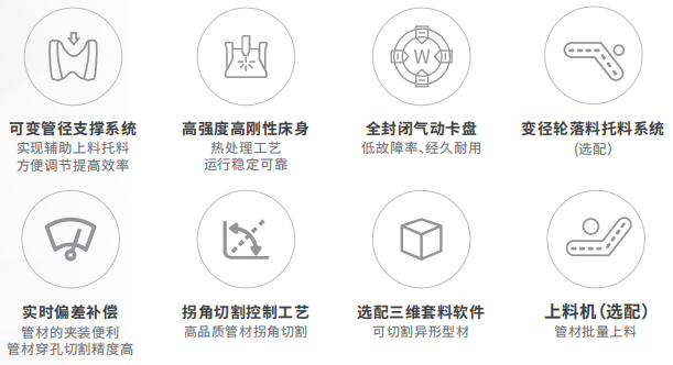 2. 通過套料軟件實現零件的排樣、共邊、基本工藝和特殊工藝的處理,加工中可實現實時尋中糾偏補償,管面輪廓修正、管拐角工藝、快速蛙跳等;